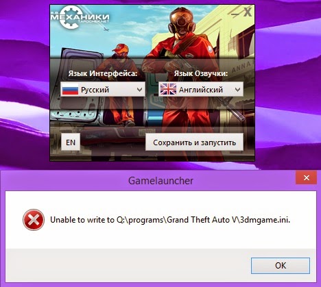 Если у вас возникает такая ошибка, то она очень легко решается, заходим в папку с игрой, для этого щёлкаем правой кнопкой мыши на ярлык гта5, свойства, расположение файла, в папке находим 3dgame.ini щёлкаем правой кнопкой мыши, свойства, убираем галочку с только для чтения, применяем, играем:)
